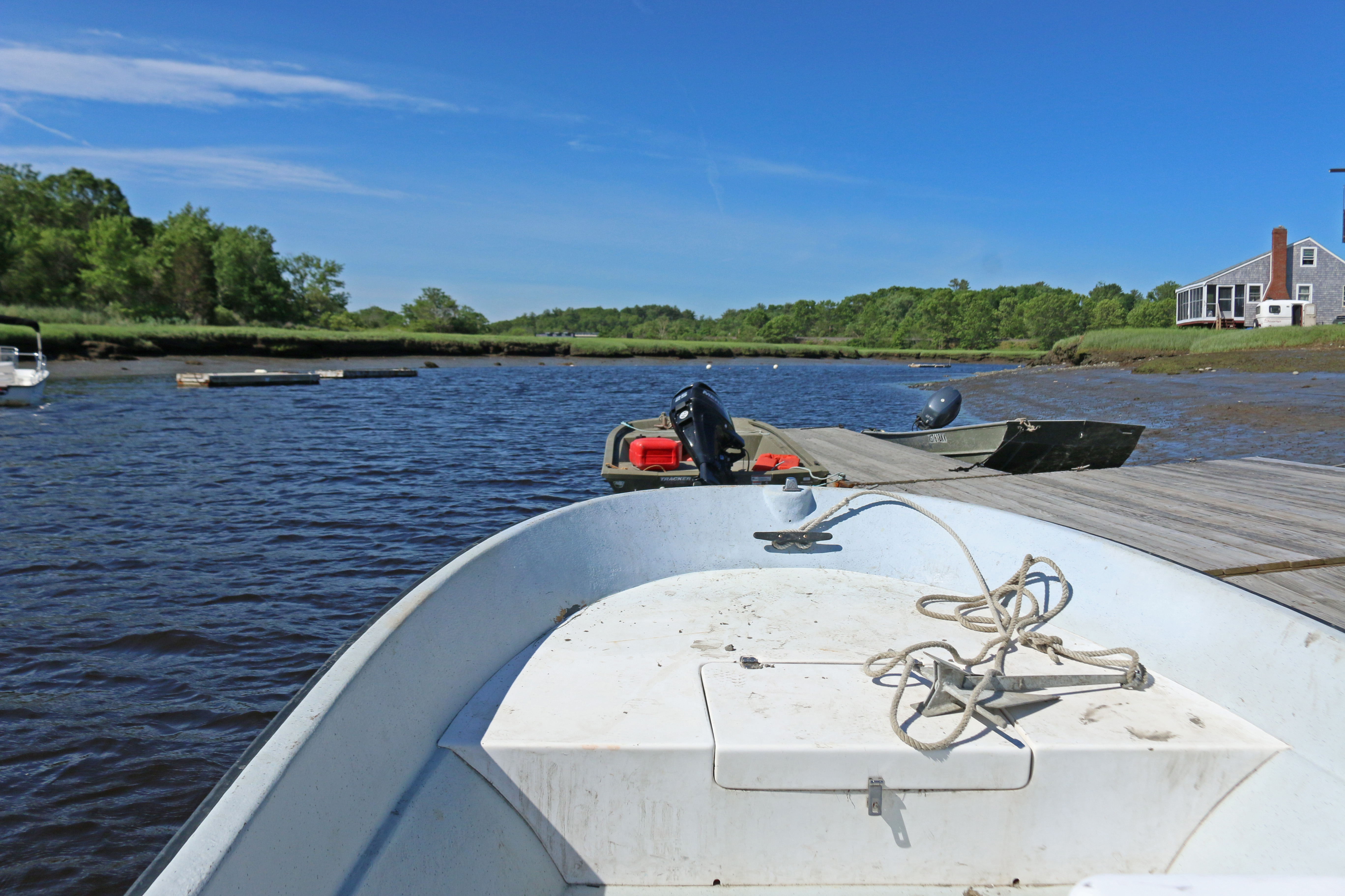 Samuel Kelsey, Inke Forbich, and I loaded into the boat at the Plum Island Ecosystem Long Term Ecological Research site (PIE-LTER) dock. The tide was high, water lapping against the mud banks of the marsh creek. Smooth cordgrass waved slightly in the ocean breezes above the shoreline, showing off their early summer emerald hues. Where the earth rose slightly higher, an oval of trees stretched upwards. Here and there a hunting cabin perched on the edge of the marsh, disconnected from power or water but sporting incredible views from their rough wooden porches.